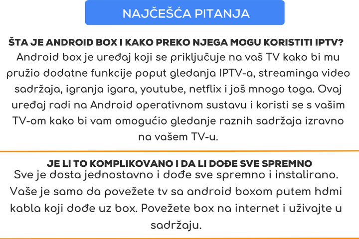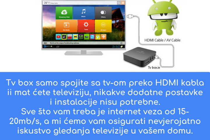 Sve je dosta jednostavno i dođe sve spremno i instalirano. Vaše je samo da povežete tv sa android boxom putem hdmi kabla koji dođe uz box. Povežete box na internet i uživajte u sadržaju.