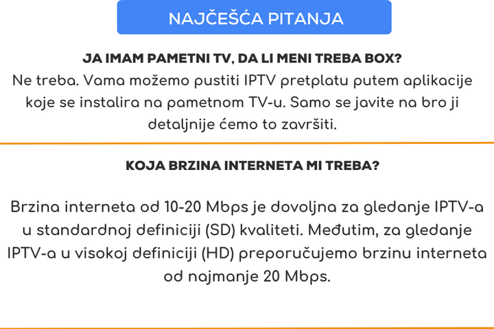 Brzina interneta od 10-20 Mbps je dovoljna za gledanje IPTV-a u standardnoj definiciji (SD) kvaliteti. Međutim, za gledanje IPTV-a u visokoj definiciji (HD) preporučujemo brzinu interneta od najmanje 20 Mbps.