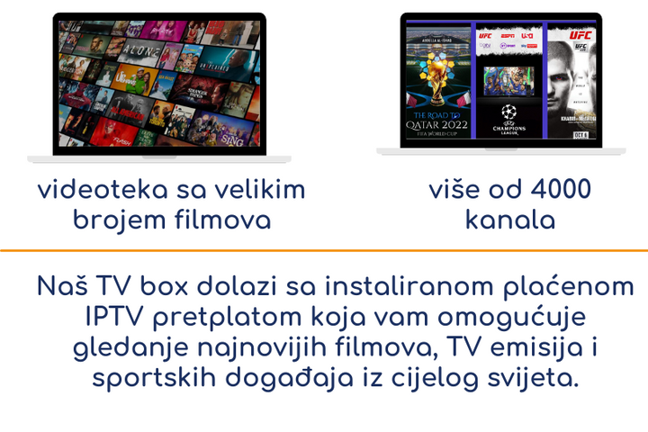 🌍🎬 Naš TV box dolazi s instaliranom plaćenom IPTV pretplatom koja vam omogućuje gledanje najnovijih filmova, TV emisija i sportskih događaja iz cijelog svijeta.