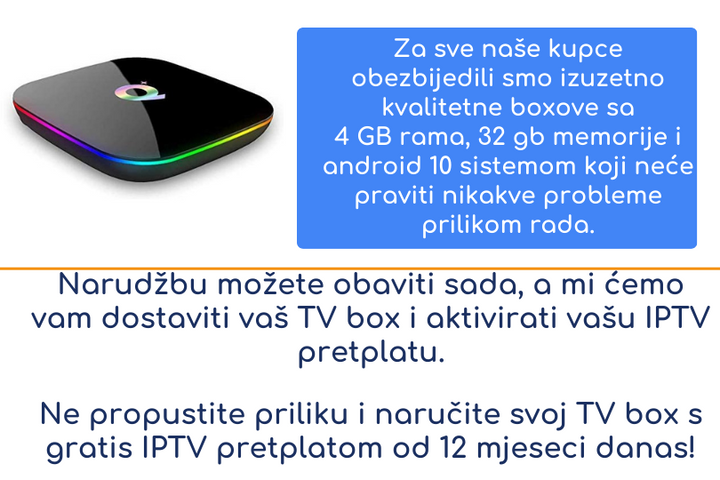 Naručite svoj Android TV Box Q danas i uživajte u besplatnoj IPTV pretplati od 12 mjeseci!