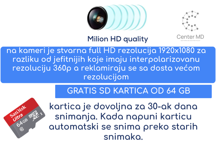 PIR senzor reaguje na svaki pokret, automatski snima i obavještava vas putem aplikacije. Snimke se mogu pohraniti na microSD karticu ili u Cloud (uz doplatu). Čak i ako se kamera ukrade, vaši podaci su sigurni!