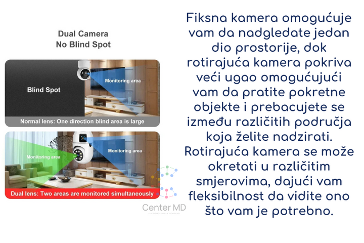 🔄 Dvostruka kamera za maksimalnu preglednost – Dvije kamere omogućuju snimanje iz različitih uglova i osiguravaju potpunu pokrivenost prostora!