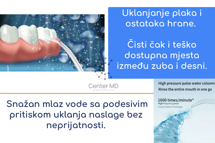 Snažan mlaz vode prodire u teško dostupna mjesta između zuba i ispod linije desni, osiguravajući dubinsko čišćenje koje klasična četkica za zube ne može postići.