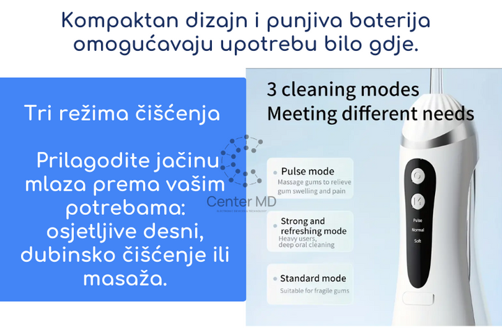 Snažan mlaz vode uklanja naslage bez neprijatnosti, a podesivi režimi pritiska omogućavaju prilagođavanje vašim potrebama – od osjetljivih desni do dubinskog čišćenja.