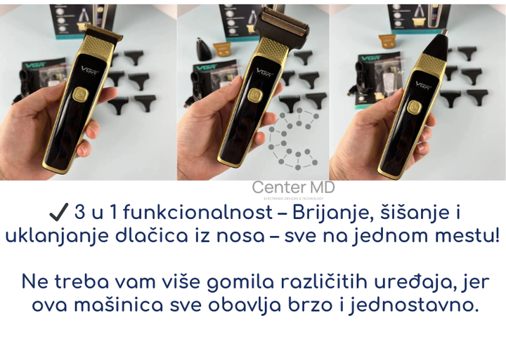✔ 3 u 1 funkcionalnost – Brijanje, šišanje i uklanjanje dlačica iz nosa – sve na jednom mestu! Ne treba mu više gomila različitih uređaja, jer ova mašinica sve obavlja brzo i jednostavno.